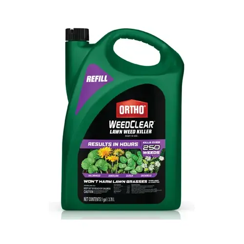 Ortho WEEDCLEAR lawn weed killer ready-to-use1 refill kills many types of broadleaf weeds and it won't harm your lawn. With results in hours, it kills over 250 weeds down to the roots, including dandelion, clover, oxalis, chickweed, knotweed, plantain, henbit & spurge. This refill bottle can be used with an Ortho WEEDCLEAR comfort wand. For use on multiple lawn varieties, including Kentucky bluegrass, perennial ryegrass, fescues, common Bermuda grass, hybrid Bermuda grass, Bahia grass, bent grass, buffalo grass, centipede grass, zoysiagrass and St. Augustine grass (except Floratam). Use Ortho WEEDCLEAR lawn weed killer to kill weeds to the roots.