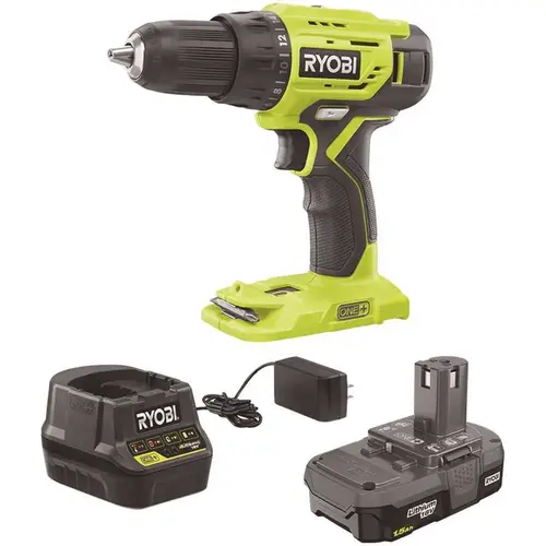 RYOBI introduces the 18-Volt ONE+ Lithium-Ion Cordless 1/2 in. Drill/Driver Kit with 1.5 Ah Battery and Charger. The drill/driver features a 1/2 in. keyless chuck with a 24-position clutch and 2- speed gear box that adjusts the torque output to control the depth of the screw or fastener. This kit is powered a lithium-ion battery that holds a charge up to 4X longer, offers up to 20% more run time and is 45% lighter weight than Ni-Cd batteries. Best of all, it's a part of the RYOBI ONE+ System of over 175 Cordless Tools that all work on the same battery platform. Backed by the RYOBI 3-Year Manufacturer's Warranty, the 18-Volt ONE+ Drill/Driver Kit includes an 18-Volt ONE+ 1.5 Ah Compact Lithium-Ion Battery, an 18-Volt ONE+ Charger, a double ended bit, and an operator's manual.