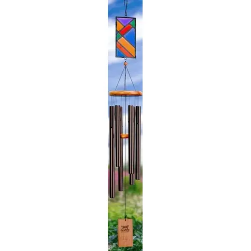 Elegantly styled 42-inch long windchimes add a flair to your garden with the new Stained-Glass design. Bronzed chime tubes accompany the bursts of color created by the light shining through stained glass panel atop the chimes. Generous size and design will complement both modern and rustic surroundings.