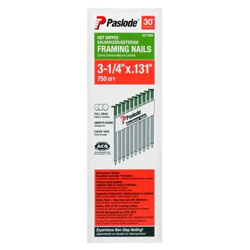 Our hot dipped galvanized Nails are independently proven to be the leader in galvanized fastening. They offer premium corrosion protection and reduce staining and streaking by 80%. They're designed and manufactured to match the specs of Paslode nailers so your nailer will run smooth, with fewer misfires and jams while driving flush, even into the toughest materials. They're IRC R319.3 code approved for use in pressure treated lumber in accordance with ASTM A 153. Rigid and compact, the RounDrive paper tape design gives you 10% more nails per strip. Plus, they are more durable and easier to handle than generic nails. Paslode nails are designed to reduce jams and misfires when used with Paslode nailers.