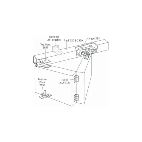(1) ea 280A Mill Finished Aluminum Track; (1) ea 283 Hanger; (1) ea 289T Top Pivot; (1) ea 289B Bottom Pivot; 3 ea 282HD26 Hinges; (1) ea 106HF/94 Roller Guide; (1) ea 94A Aluminum Guide Channel; (1) ea Adjusting Wrench and Mounting Hardware