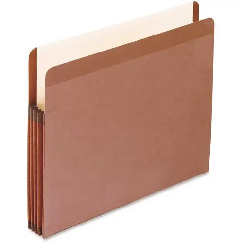 Premium-quality red fiber file pockets are cross-bonded and feature rip-proof, full premium polyester gussets. The double reinforcements at the gusset tops and bottom corners provide maximum durability and capacity. Laminated tops offer extra-durability. Double-thick front and manila lined back provide sturdy protection. Moisture-resistant coating on file pockets protects against spills.