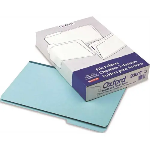 Use these pressboard folders for heavy-duty and bulky records. 25 point blue pressboard offers a sturdy construction. Folders offer a 1 in. expanding, extra-strong, tape-reinforced gusset at bottom, 9-1/2 in. H and 1/3-cut tabs in assorted positions.