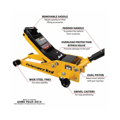 Dual piston 3-Ton Rapid Lift Jack, raises most vehicles with just 3-1/2 pumps. Precision-welded steel construction, with powder coat finish, and rust-resistant hardware. Removable saddle, adapts quickly to other lifting accessories. Modern design is ideal for the extra-low profile vehicles. Heavy duty ball bearing rear swivel casters for complete mobility. Lift capacity of up to 6000 lb., and a lift range of 3-1/4 in. to 20 in. 45-1/2 in. long handle with a foam sleeve to protect the vehicles side panel from scratches.