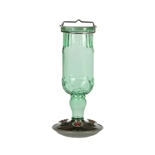 The Perky-Pet green antique bottle hummingbird feeder will bring a classic touch to your yard and provide your tiny feathered friends with a tasty treat! This large capacity feeder holds 24 oz of nectar to ensure that there will be plenty of nectar to go around! The metal base has for flower feeding ports with brushed silver accents. Cleaning is simple with the removable base and hanging is a breeze with the attached metal hanger.