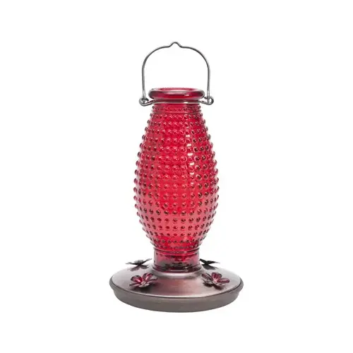 Hummingbirds will be attracted to the 4 red flower feeding ports on the brushed copper base of this hummingbird feeder. With a 16 oz nectar capacity, your hummingbirds will always be well fed. Easily hang this feeder wherever you choose with the attached metal hanging hook.