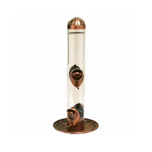This elegant tube feeder features our 2-in-1 port technology, allowing you to attract a larger variety of birds. The Perky-Pet copper 2-in-1 wild bird feeder features an exclusive design allowing for easy switching from a mixed/sunflower setting to a thistle/finch mix position - the multi-food choice allows for variety in the wild birds stopping by for a meal. The feeder holds 1 lb of seed and has four feeding stations with offset perches that allow you to see more birds at one time. The antique copper finish of this 2-in-1 feeder is sure to be an elegant addition to your yard. The bird-friendly tray will catch seeds and shells, creating less mess and the removable base makes cleaning this feeder easy. The clear, shatterproof plastic reservoir makes it easy to monitor seed levels. Remember to clean your feeder once every two weeks with mild soap and water solution.