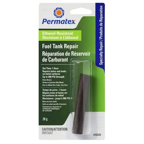 A two-part, hand kneadable, putty type epoxy stick used for repairing metal gas tanks and containers. Contrasting colored materials are mixed together to form a uniform color to indicate thorough mixing. The resulting cured adhesive can be drilled, sanded, threaded or filed and it is resistant to fuels and most solvents after full cure.