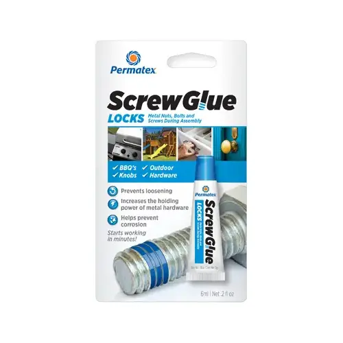 ScrewGlue secures and increases the holding power of metal nuts, bolts and screws during assembly of everyday items around the home. Use ScrewGlue locks on items inside and outside the home to ensure a tight connection that won't loosen overtime due to vibration or frequent use. ScrewGlue also prevents weather related corrosion of threads.