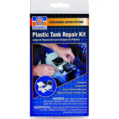 Complete kit contains everything required for making professional quality permanent repairs in just minutes. State-of-the-art components and easy-to-follow instructions with photographs. Repairs all types of plastic tanks. The repair resin is designed to harden within 8 to 10 min and cures in 30 min. Repairs can be made ideally at temperatures from 50 to 75 deg F. Repairs cracks up to 4 in long and holes up to 3/8 in Dia.