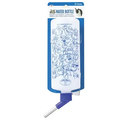 This water bottle is constructed from strong, opaque plastic with colorful graphics. Features stainless steel ballpoint tube and no-leak seal design to keep your pet's water clean and housing dry. Includes metal hanger for attaching to wire hutch, fence or aquarium. Ideal for rabbits, guinea pigs, ferrets and other small animals and reptiles. 3 in Dia bottle holds 32 oz (1 qt).