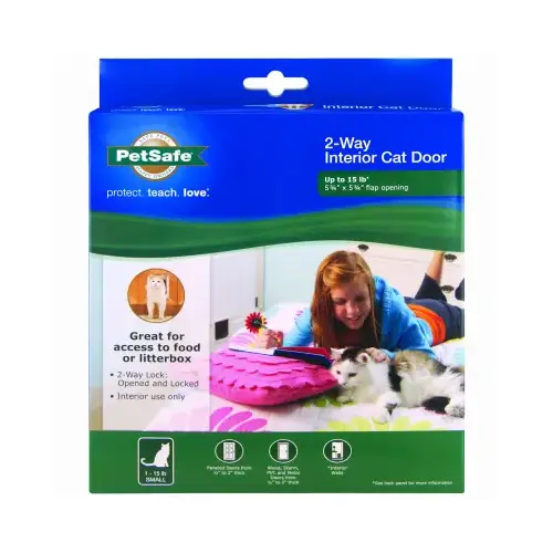 Give your cat access to her litter box without giving her litter box access to your home. This durable cat flap fits any interior door that's 1 to 2 in THK. Your cat can come and go from the room where her litter box is housed even when the door is closed. A sliding lock gives you the option to bar access whenever you choose.