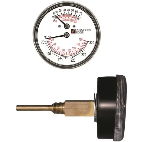 Boiler Temperature and Pressure-Gauge measures between 60° and 320°F. The pressure-Gauge measures between 0 - 75 psi. This-Gauge can be used with your HVAC system and parts.