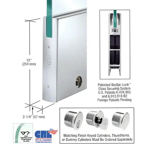 CRL Wedge-Lock Door Rail System features the exclusive CRL Wedge-Lock Securing System (U.S. Patents 6,434,905 and 6,912,818 B2, Canadian Patent 2,419,706, and European Patent No. EP 1 404 939 B1). A concept for securing the glass in the door rail. It works by applying pressure from the bottom of the door rail, using two glass retaining aluminum extrusions via a flat stainless steel bar. As this bar is pulled down with socket head cap bolts, pressure is applied to the glass retaining aluminum extrusions. The bottom of the extrusions are at an angle and fit into an angled groove in the door rail. As the glass retaining extrusions are being pulled down, the angled wedge in the door rail also pulls the glass retaining extrusions together. This action, along with our specially designed door retaining gasket, creates a tremendous amount of force (more than 900 lbs.) in our 9" (228.6 mm) Corner Rail. That's 100 lbs. per inch. Imagine how much force is created in our full length 35-3/4" (908 mm) Door Rails!