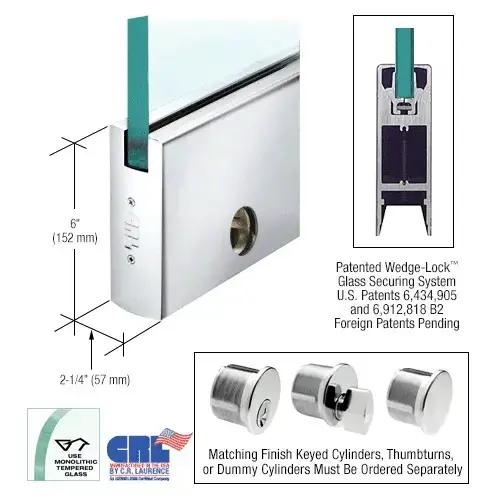 CRL Wedge-Lock Door Rails come in several standard finishes, and can be quoted in custom finishes and widths upon request. Rail Specifications, Templates and Hardware Packages are available from our Technical Sales Department.
