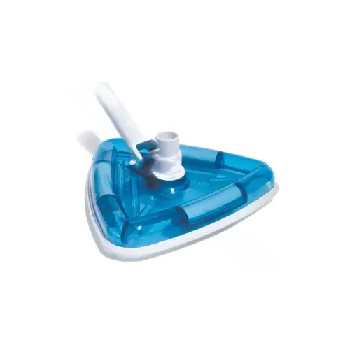 This triangular Poolmaster Clear-View Vacuum Head is equipped with a polypropylene brush for harder scrubbing of the floors of in-ground or above-ground pools. It is reliable and effective in the removal of debris from vinyl liner pools. It's provided with non-corrosive and translucent ABS for full-view cleaning. Evenly balanced weight placed for increased floating resistance. Its polypropylene brushes are durable yet replaceable. It also gets a bumper for avoiding scratches. This product is compatible with standard pool poles and vacuum hoses.