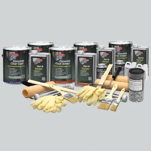 (3) Cans POR-15 Concrete Floor Armor Part A, (3) Cans POR-15 Part B Floor Armor Hardener Activator, POR-15 Non-Slip Aggregate, 16 oz POR-15 Grease and Oil Remover, (2) 1/4 in Nap Roller Cover, 1/2 in Nap Roller Cover, (2) 9 in Roller Frames, (3) Chip....