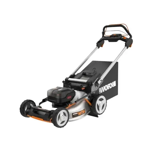 WORX NITRO Lawn Mower, Cordless, Lithium-Ion Battery, 5 Ah Battery, 40 V Battery, 20 in Cutting Width, 1.6 to 4 in Cutting Height, Number of Height Positions: 7, Single-Lever Height Adjustment, Self-Propelled Transmission, Catcher Capacity: 2 bu, Mulching Capability: Yes, Discharge Location: Side, 1 Blades, Cutting Lawn Yard Size: 1/4 to 1/2 acre, Variable-Speed Control, Adjustable Handle, 10 in Rear Wheel, 8 in Front Wheel, 35 to 40 min Battery Run, 1 hr Charge Time, Steel Deck, Dimensions: 42.72 in H x 21.85 in W x 61.06 in D, Includes: (1) Collection Bag, (1) Side-Discharge Chute, (2) WA3571 5 Ah Batteries and (1) WA3884 Charger