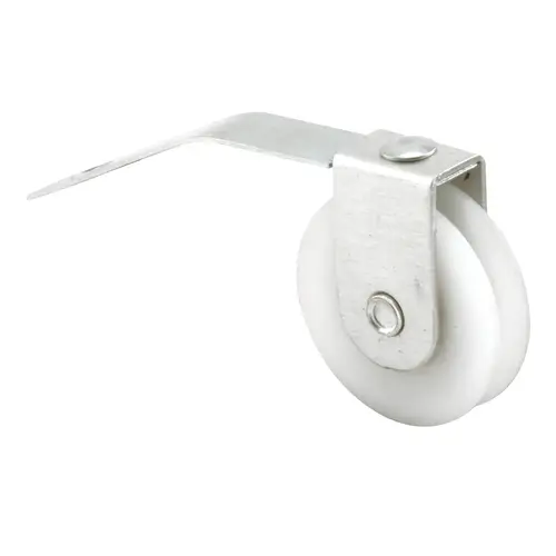 Bent spring design used by Academy Mfg. and others. Center grooved 5/16 in W wheel, 2-1/4 in L x 5/16 in W flat high-tension heat-treated steel spring and #8 x 3/8 in Phillips sheet metal screw.