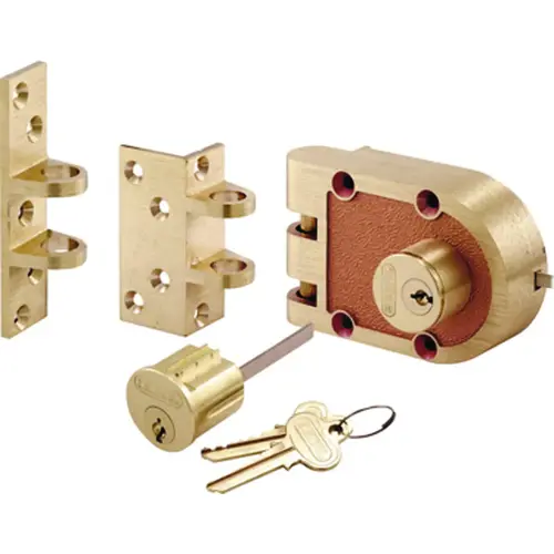 Deadbolt housing constructed of solid high strength bronze alloy, jimmy-proof design prohibits forced entry by spreading of door frames. Surface mounted, cross bolt locking feature also resists forced entry and mounts to wood or metal doors and frames.