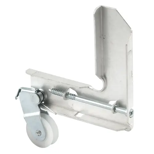 This sliding screen door corner assembly is used on Acorn Industries doors and several other manufacturers. It is an all-in-one corner and roller combination. It is made of stamped steel with an adjustment screw and center grooved high density polyethylene roller attached at the end of the bottom leg. The roller is 15/16 in Dia. The corner fits into the sliding screen door frame holding the bottom or top rails and the side stiles together.