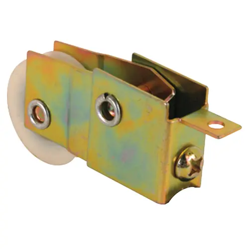 Nylon ball bearing roller; adjustable steel housing assembly; used by Rebco-West. Housing dimensions: thickness 11/16 in; length 1-1/8 in; height 1-3/8 in; overall thickness 13/16 in. Housing width: 11/16 in. Roller edge type: Concave.