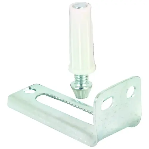 Used by many door manufacturers. Adjustable stamped steel bracket. 2-15/16 in L x 1 in D x 1-1/4 in H overall. Bottom pivot with 7/16 in OD stem, nylon base and steel pin that has a 1/2 in OD tip with 3/8 in W groove. Includes bracket, bottom pivot and 3 installation screws.