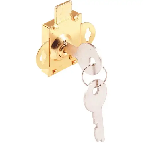 This brass plated mail box lock is constructed of steel and fits on mailboxes manufactured by Cole and Columbia. The bolt of this lock protrudes 1/4 in. from the housing and features a bolt throw of an additional 1/4 in. The bolt to this lock measures 1/2 in. in length when fully extended, but it does not retract completely into the housing with a travel distance of 1/4 in. The key to this mail box lock can only be removed when in the locked position.