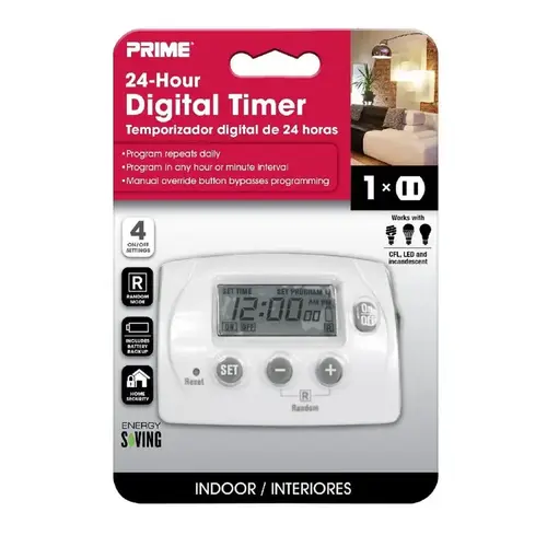 1-Outlet Indoor Digital 24Hr Timer w/ 4 Programs. 24hr Repeating Cycle - Turns outlets on and off same time daily. 4 Programmable On/Off Settings - Multiple settings that repeat daily. Patented Angled Housing Design and Large LCD Screen - Makes unit easy to read and program. Random "Vacation" Mode - Adjust on/off preset times by up to 30 minutes. Quick Charge - Initial 30 minute charge provides power to program unit while unplugged, enabling programming without the timer being plugged in. Battery Backup - Maintains timer settings during power outages.