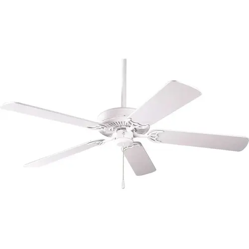 Airpro Builder 52" 5-blade Ceiling Fan. White Blades With White Finish.. Powerful And Reversible 3-speed Motor W/ Triple-capacitor Control.. Includes Innovative Canopy System For Sloped Ceilings Up To 12:12 Pitch.. Energy Star Certified With 30 Year Limited Warranty.. Screws Preinstalled In Blades For Attachment To Motor Arms.. Sure Connect Blade Attachment System Included.. Compatible With Universal Light Kits. Mfg #P2501-30W
