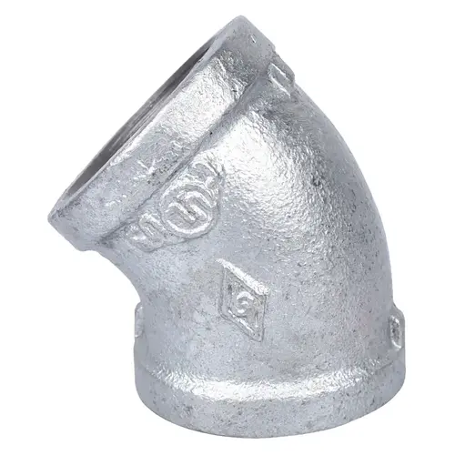 This galvanized 45 degree elbow is used to change direction in piping. It's suitable for use with water or steam. Flat banded, right hand threads.