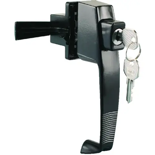 This push button door latches comes finished in black. It is designed for use on outswinging wood or metal screen or storm doors.