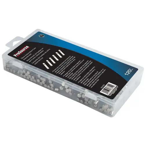 ProSource AGC Automotive Glass Fuse Assortment keeps automotive and electrical devices safe from short circuits and overloads. The assortment includes 120 pieces neatly organized in a divided PVC storage case.