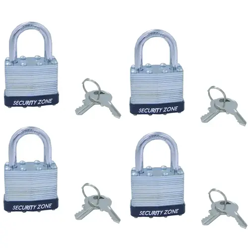 The ProSource keyed padlock is an indoor and outdoor lock. Best used for residential gates & fences, sheds, workshops & garages, tool boxes and more. The key lock features a laminated steel body and a hardened steel shackle for strength and security. It includes four padlocks with two keys ea; Both keys open all locks.