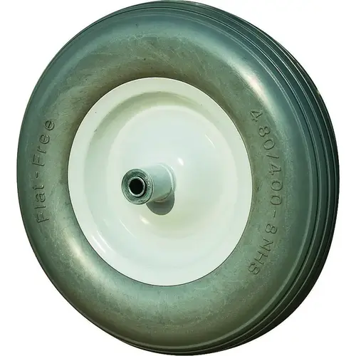 This wheelbarrow tire replaces the wheel on wheelbarrow #6991897. Flat-free, ribbed tread pattern and made of polyurethane foam. The welded metal rim is incredibly durable and allows smooth operation. Great for working on rough, rocky, and uneven terrain.