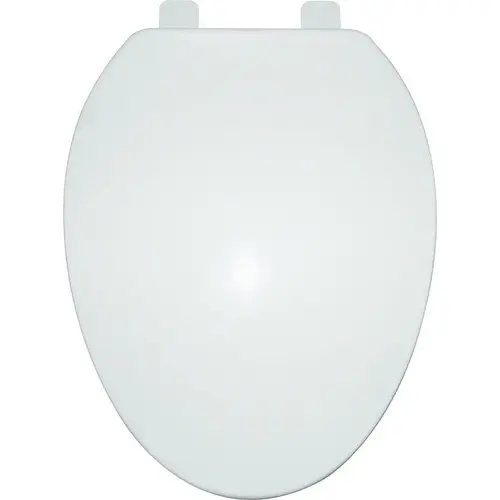 The ProSource toilet seat is made of polypropylene. The hinge closes slowly and silently with the tap of a finger. Includes adjustable plastic hinges, bolts, and nuts.