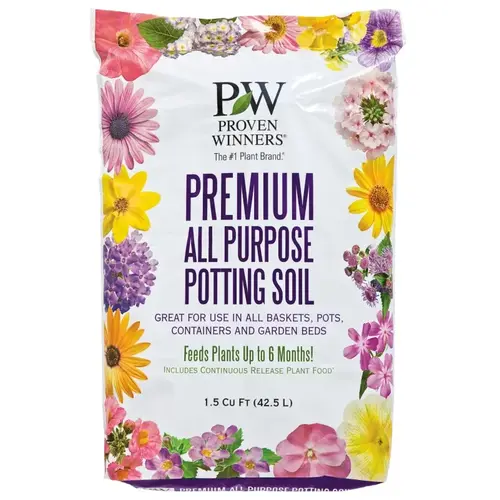 Proven Winners premium potting soil is a professional-grade soil for homeowner use made from a blend of composted bark, premium Canadian Sphagnum peat moss and horticultural grade perlite. Premixed with Proven Winners 15-7-15 + Minors Premium Continuous Release Plant Food, which provides a continuous nutrient release to help ensure consistent feeding while providing a base level of nutrition.
