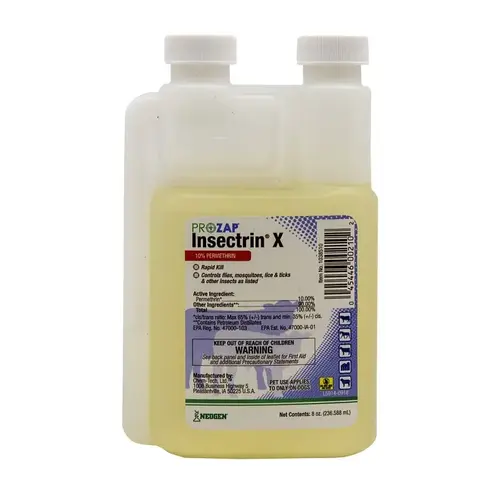 Prozap Insectrin X Concentrate, Liquid, Yellow, Odor/Scent: Aromatic, Net Content: 8 oz, Compositions: Aromatic 150, Permethrin (ISO), Sponto 300T, Sponto 500T, Flash Point: 62.8 deg C, Density: 0.8388 to 8987 g/cc, pH Range: 7, Application Method: Spray