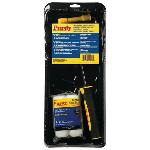 Purdy White Dove Jumbo Mini Paint Roller Kit, Specifications: 3/8 in Nap, 4-1/2 in Roller, Plastic, Number of Pieces: 4, Includes: (1) Heavy-Duty Plastic 1 qt Tray, (1) 12 in Jumbo Mini Roller Frame, (2) 4-1/2 in Whitedove Roller Cover
