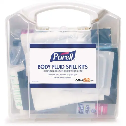 Plastic clam shell with 2 single use refills featuring head-to-toe personal protection and cleanup products to safely remove body fluid spills, and help prevent the spread of germs that can cause illness. Provides a comprehensive solution to help reduce the risk of Norovirus outbreaks. Safely removes vomit, blood, feces and other body fluids. PURELL Foodservice Surface Sanitizer is effective against Norovirus, E.coli, Salmonella and more in just 30-seconds, and is proven effective on most hard and soft surfaces.