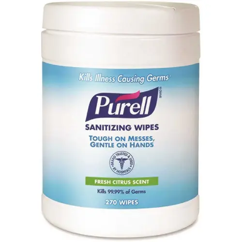 Sanitizing wipes kill 99.99% of most common germs in as little as 15-seconds. Use this tub dispenser of Purell Sanitizing Wipes with floor stands and wall brackets (both sold separately) to create a positive and lasting impression with guests, customers and employees. Tested for surface compatibility, wipes do not harm vinyl, plastic, metal or rubber. Non-linting, durable, textured wipe is convenient for use whenever soap and water are not available. Each wipe measures 6 in. x 6-3/4 in.