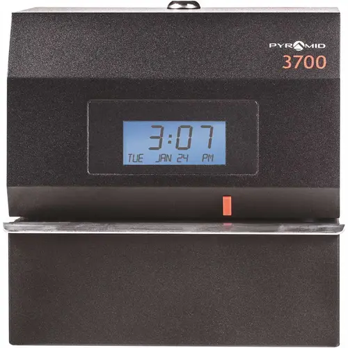 The Pyramid Time Systems 3700 Heavy-duty Time Clock and Document Stamp is constructed of industrial-grade steel to hold up under harsh workplaces such as garages, warehouses, manufacturing facilities and environments with dirt, debris or damage potential. Keep track of job costs, record employee time and attendance or stamp the date, time and up to 14 pre-programmed message options on time-sensitive documents such as incoming mail, attendance logs or legal paperwork. Side-loading time card and document feed handles left or right hand printing orientation.