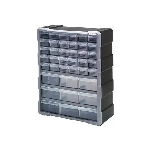 QUANTUM STORAGE SYSTEMS Small Parts Organizer, Number of Drawers: 39, Drawer Material: Polypropylene, Drawer Color: Clear, Polypropylene, Black, 15 in L, 6-1/4 in W, 18-3/4 in H