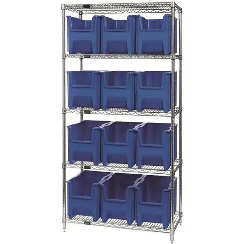 Organize, store and access medium or large parts with WR5-600BL high capacity bin center. Wire allows air to circulate and light to penetrate for increased product visibility. Capacity per shelf 800 lbs.