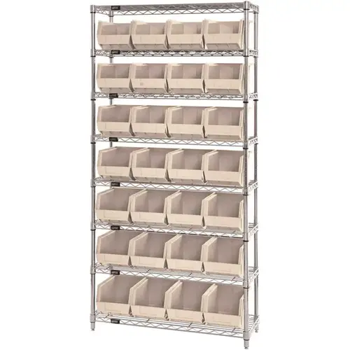 The WR8-240IV Wire Shelving Shelf Bin System - Complete Wire Package is made up of 8 shelves and has 28 QU240 bins. Unit features an all-welded construction which incorporates wire trussing. Bins all have open hopper fronts for quick access to stored items.