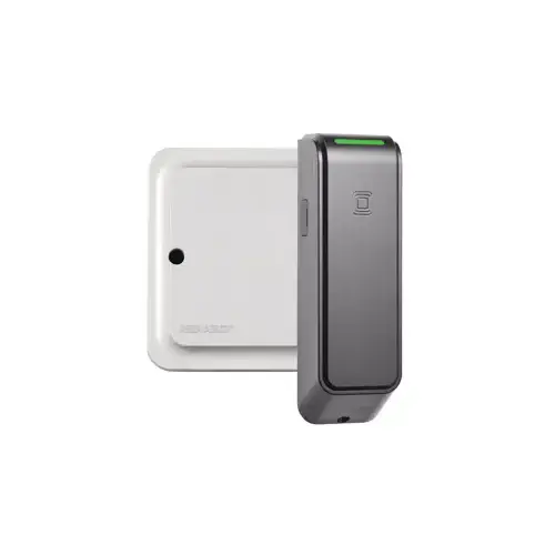 The R100 surface mounted wireless reader with Aperio technology offers an elegant way to extend access control to glass, stone, granite or marble entryways. Installation is easy, requires no drilling or pulling of wires and can adhere in minutes. A complement to ASSA ABLOY electrified locking devices, including electro-magnetic locks, electrified strikes, electric locks and electrified exit devices, glass entryways can now integrate robust access control while maintaining a clean, wireless appearance. Adheres to glass surface without any connecting wires. Online transaction audit trail capability. Low battery signaling and reporting. Green status LED indicator. Shortened wire pull from panel to hub provides cost benefit in installation. Fully-encrypted AES 128 wireless communication. Low frequency model supports PROX and EM PROX. High frequency model supports iCLASS, iCLASS Seos, iCLASS SE, ISO14443B UID, Mifare, Mifare Plus, Desfire SE, Desfire EV1, NFC. Battery: 1 x 3V CR2 Lithium Battery.