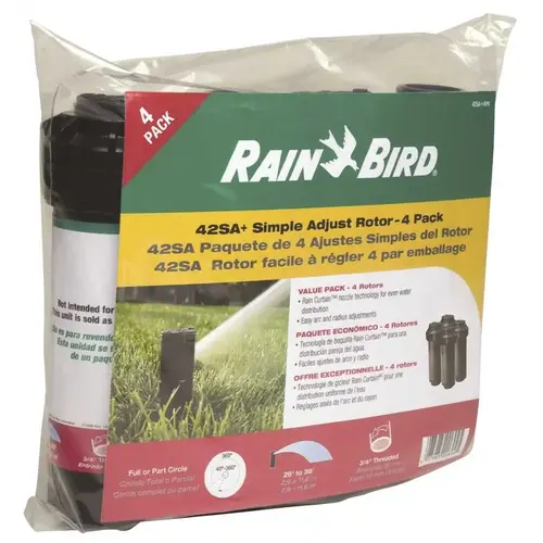 This professional grade Rain Bird 42SA+ rotor sprinkler features superior durability plus exceptional watering uniformity of patented Rain Curtain nozzle technology, resulting in a greener and more even lawn with reduced watering time. The rotor distributes larger water droplets that cover evenly throughout the pattern, also reducing wind-blown overspray. Nozzle micro ramps direct a portion of the spray near the head, adding gentle close-in coverage with reduced watering velocity that won't wash out new seed. Simple top adjustments for arc and distance help you keep water on the grass, not spraying on the house, sidewalk or driveway. The rotor also features a rugged dual-action, positive stop wiper seal that protects internals from debris and, together with a heavy duty stainless steel spring, assures positive retraction for leak-free performance. It installs on a standard 3/4 in. riser for simple replacement of older rotors.