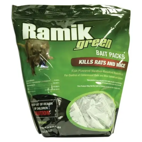 Bait kills and controls Norway rats, roof rats and house mice indoors or outdoors. Green, fish flavored nuggets retain its effectiveness, even in difficult conditions. Bag contains 16 (4 oz) bait packs. Contains the active ingredient diphacinone. Replacement item for Sku #953.9016.