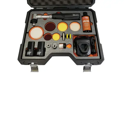 RBL Products Single Step Polish, Brush, (24) 2000 Grit Engineered Abrasive Discs, 3 mm For Offset Sanding, 12 mm For Polishing, Rotary Adapter, 1 in, 2 in and 3 in Foam and Wool Pad For Compounding and Final Polishing, Rotary Adapter, (2) Batteries a....