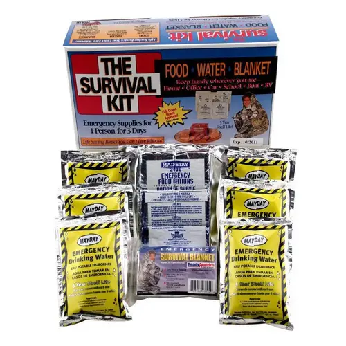 Ready America Survival Kit, Plastic, Includes: (1) Emergency Survival Blanket, (1) Litho Box, (1) Food Bar, (6) 4.225 oz Water Packets